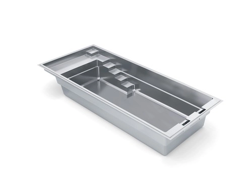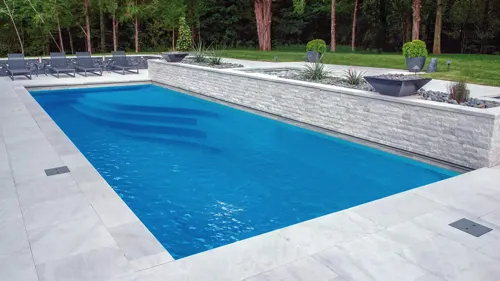 One of our European style inground fiberglass swimming pools, this features a distinctive and eye-catching high-water line. It allows the water in your pool to be almost to the very top of your pool creating a visually stunning swimming pool design. Style and function in one pool.