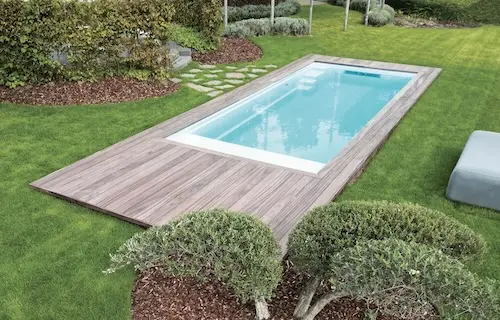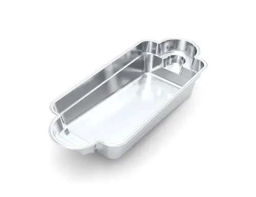 With entry steps and a small bench for seating, this rectangular design is an award winner. It simply looks good anywhere, in almost any backyard, whether it be small or large. This is the quintessential inground fiberglass swimming pool that makes everyone happy.